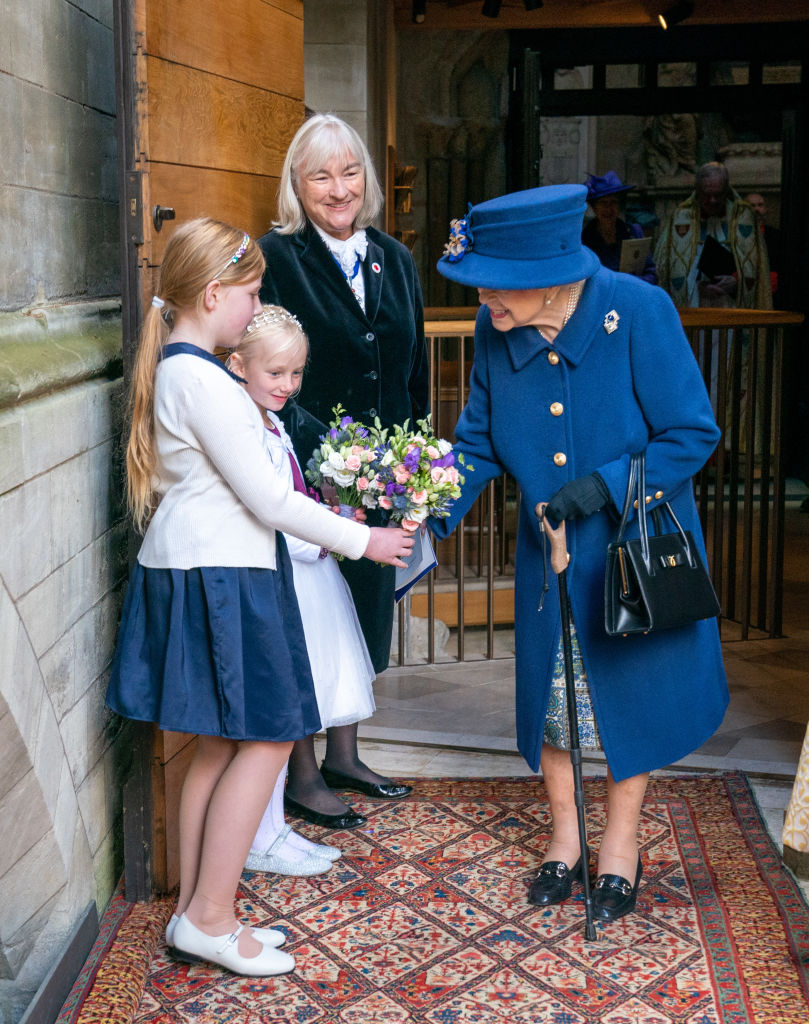 Dressed in royal blue, the monarch arrived with a simple black cane with a wooden handle, which she used as a mobility aid throughout her time there.