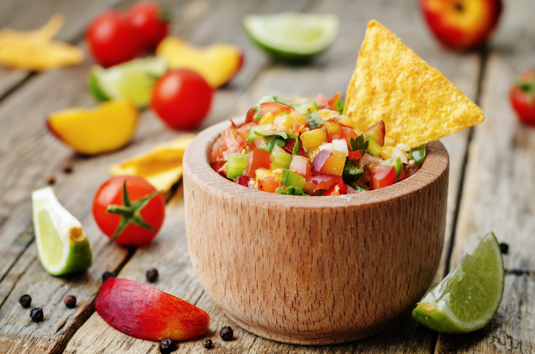 Many peach salsa recipes combine the diced fruit with onions, cilantro, lime juice and jalapeño. Additional ingredients like tomatoes and mint can be added to create a more vibrant mixture. These ingredients produce a salsa with the right balance of sweet and savory flavors. So, it can do double duty as a refreshing snack or homemade condiment for grilled meats, tacos or sandwiches.