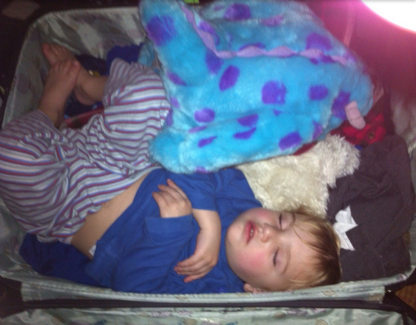 When his parents asked his brother where he was (they could only hear him snoring), his brother responded, "Oh, he's sleeping in the suitcase again." via <a href="https://imgur.com/gallery/EhstXIQ" target="blank">Imgur_